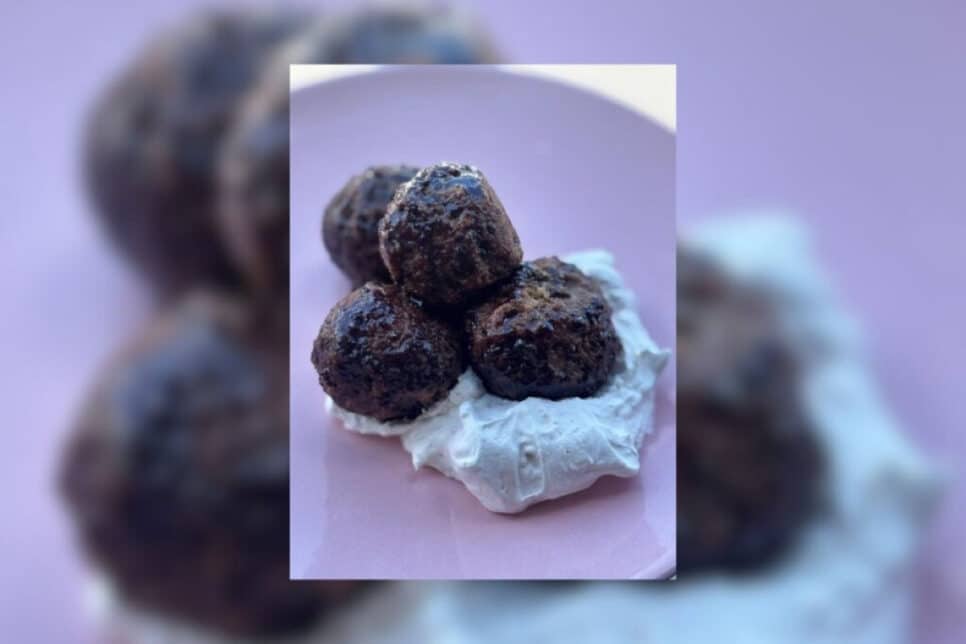 Sirva com creme de mascarpone e açúcar de confeiteiro, gelado ou em temperatura ambiente. Uma dica extra é que as bolinhas não precisam de tempo de geladeira para firmar e podem ser armazenadas por três a quatro dias, bem vedadas.