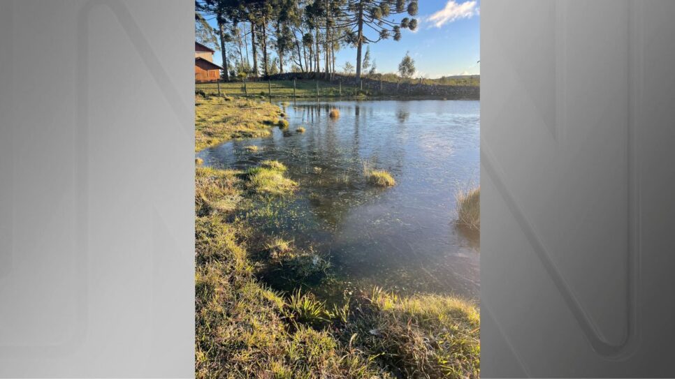 A temperatura negativa, inferior a zero, congelou um lago em São José dos Ausentes, Campos de Cima da Serra (RS). O local registrou a menor temperatura do Rio Grande do Sul na terça-feira (24): -4,9°C.