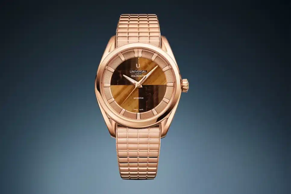O Polerouter, desenhado originalmente por Gérald Genta, volta como peça fundamental na linha clássica da Universal Genève. O design mantém elementos icônicos, como o mostrador dividido em quadrantes e as hastes torcidas, mas com um refinamento para o uso moderno.